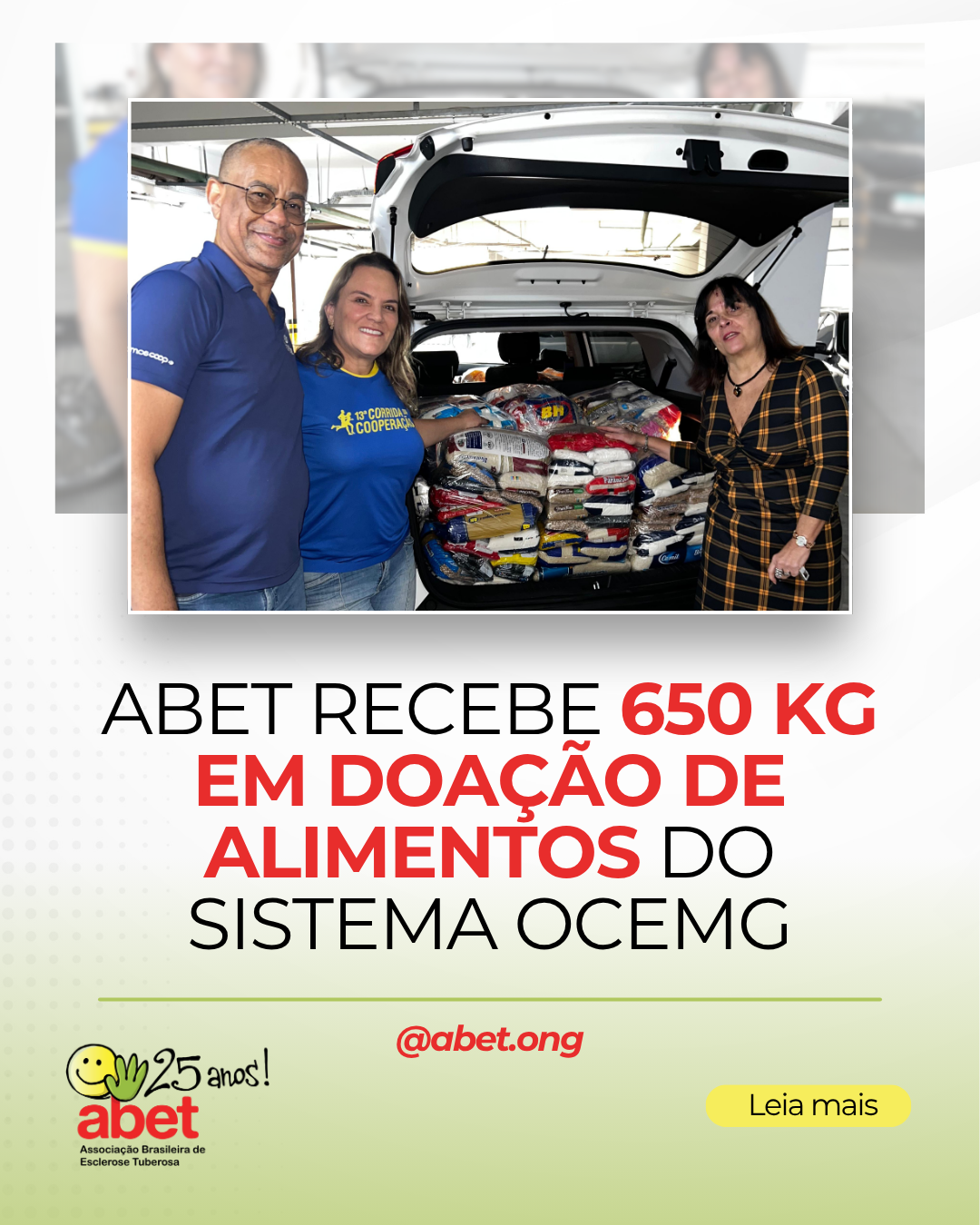 É chegada a hora de agradecermos o Sistema Ocemg pela doação de 650 quilos de alimentos, realizada no último dia 21/7/25. Como de costume, todos os anos a empresa realiza uma benfeitoria solidária que traz um afago significativo para a Associação Brasileira de Esclerose Tuberosa (ABET).