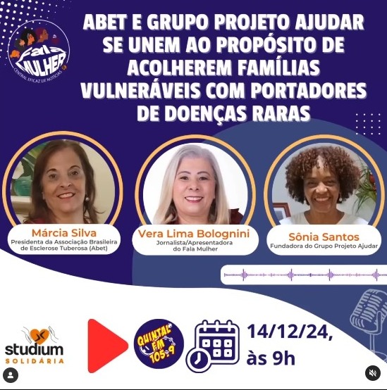 O programa Fala Mulher, transmitido na Rádio Quintal FM, recebeu Márcia Silva, presidente da Associação Brasileira de Esclerose Tuberosa (ABET), e Sônia Santos, fundadora do Grupo Projeto Ajudar.